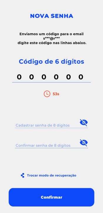 Vamos te enviar, de acordo com a opção de recuperação de senha selecionada, um código de confirmação por e-mail ou via SMS; basta autenticá-lo, criar e confirmar uma nova senha de 08 dígitos e clicar em 'Confirmar'.